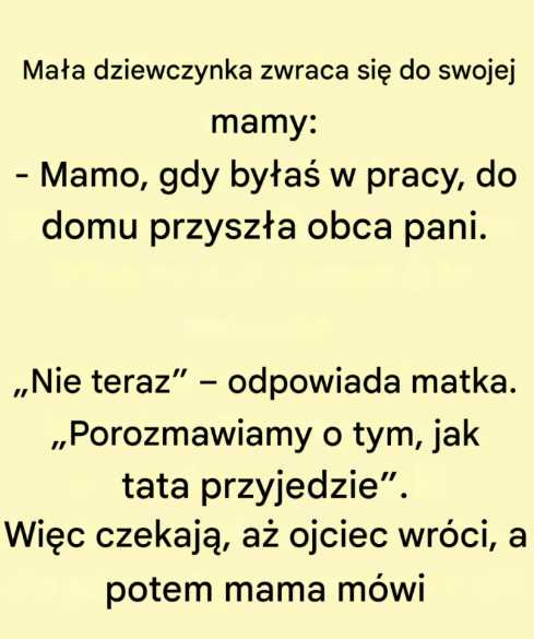 Dziewczynka, zupełnie niewinna, siada przy stole i z figlarną miną mówi coś, co burzy spokój rodziny: „Mamo, kiedy byłaś w pracy, do domu przyszła obca pani”. Choć to stwierdzenie może wydawać się niegroźne, w rzeczywistości kryje w sobie o wiele więcej, niż się wydaje . Mama, pochłonięta swoimi obowiązkami, natychmiast zastyga w bezruchu. Obca pani? Ta wzmianka budzi podejrzenia, ale mama woli odłożyć rozmowę na później, czekając na przybycie taty.