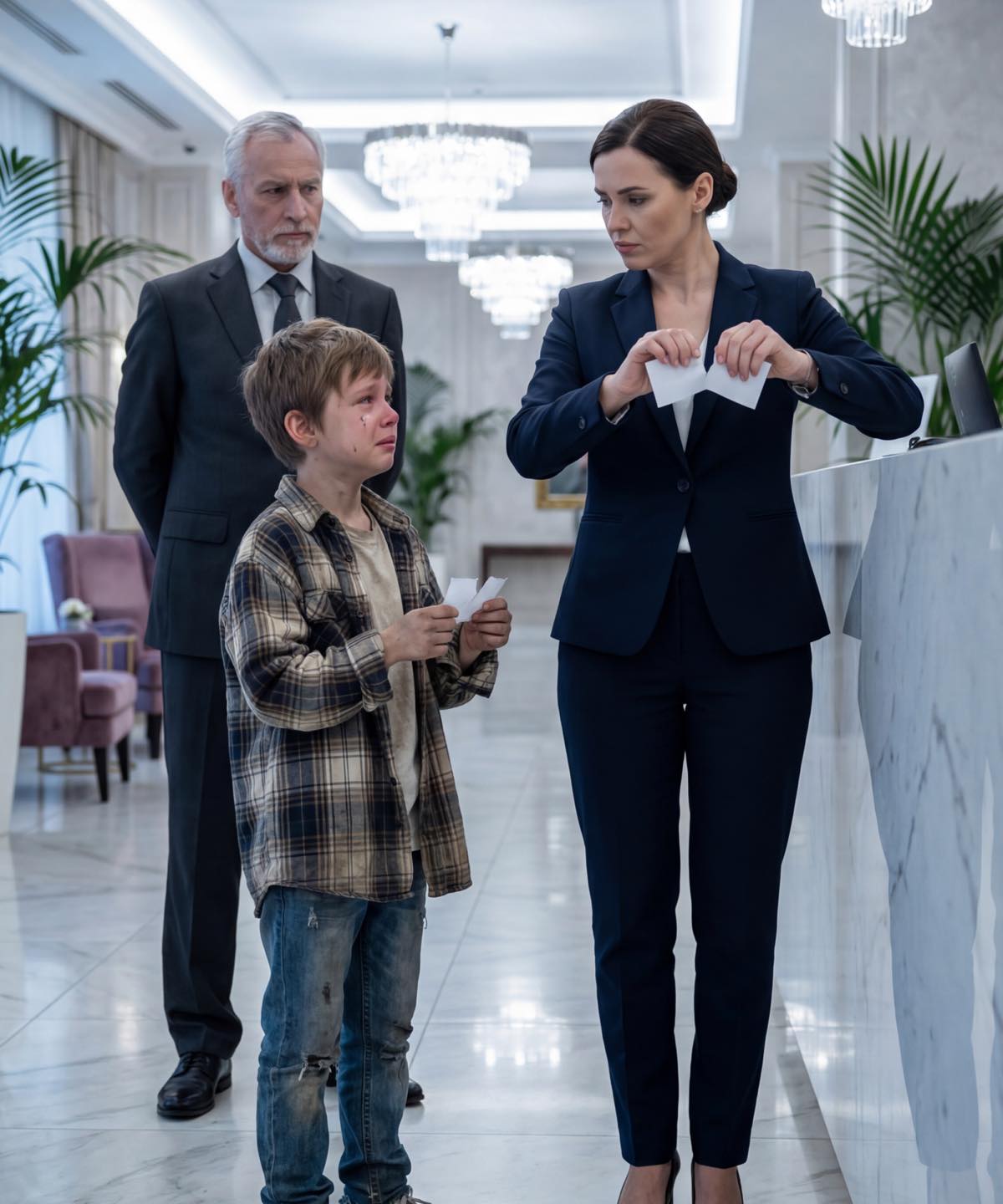 A pośród tego wszystkiego, chłopiec w znoszonych trampkach klęczał na marmurowej podłodze i zbierał podarte skrawki papieru, jakby były kawałkami jego godności.