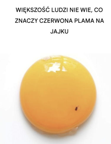 Nie, to nie jest oznaka zapłodnienia ani „nieświeżego” jaja , jak to się czasem słyszy. W rzeczywistości ta mała czerwona plamka to nic innego jak maleńkie naczynie krwionośne. Podczas formowania się jaja w ciele kury naczynie czasami lekko pęka, pozostawiając ślad na żółtku. Nie jest to ani niezwykłe , ani nienormalne, a co najważniejsze, nie jest to w ogóle niebezpieczne.