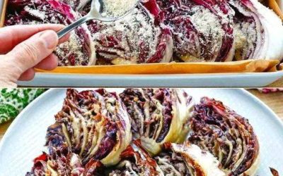 Składniki: Radicchio: 800 g Oliwa z oliwek extra virgin: 4-5 łyżek Starty parmezan: 30 g Sól morska: do smaku Pieprz:…