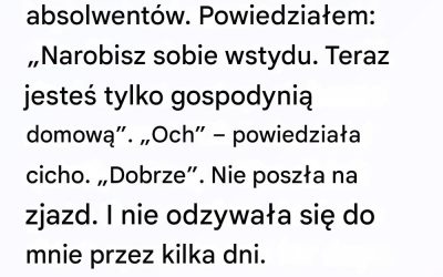 Kiedy Anna wspomniała o zjeździe absolwentów, ledwo oderwałem wzrok od telefonu. Stała przy kuchennym blacie, splatając włosy w luźny kok — tak jak zwykle, gdy próbuje brzmieć swobodnie w jakiejś ważnej sprawie. Za nią, jak zwykle, panował chaos. Jedno dziecko nie mogło znaleźć buta. Inne narzekało na pracę domową z matematyki. Niemowlę uderzało łyżeczką o tackę krzesełka do karmienia. Nasze życie. Głośne. Zwyczajne. Pełne. „W przyszłym miesiącu będą obchodzić dziesiątą rocznicę” – powiedziała lekko. „Myślałam o tym, żeby pojechać”. Wybuchnąłem krótkim śmiechem. Nie dlatego, że było śmieszne. Bo wydawało się niepotrzebne. „Dlaczego?” zapytałem. Zamrugała. „Dlaczego co?” „Po co iść?” – zapytałem, odchylając się na krześle. „Żeby móc mówić wszystkim, że zostajesz w domu i cały dzień wycierasz nosy?” Powoli odwróciła się w moją stronę. "Co?" Wzruszyłam ramionami, irytacja narastała gdzieś, czemu nie przyglądałam się zbyt uważnie. „Daj spokój, Anno. Twoje koleżanki z klasy to już pewnie chirurdzy, prawnicy, prezesi firm. Co ty na to? Że jesteś po prostu gospodynią domową?” To słowo zawisło w powietrzu niczym dym. Natychmiast dostrzegłem zmianę — sposób, w jaki jej ramiona się napięły, a usta zacisnęły w wąską linię. „Och” – powiedziała cicho. „W porządku”. Bez krzyków. Bez łez. Odwróciła się z powrotem do zlewu i wróciła do mycia naczyń. Nie poszła na zjazd absolwentów. I przez kilka dni nie odzywała się do mnie. Odpowiadała na praktyczne pytania – o której kończy się trening piłkarski, czy potrzebujemy mleka, kiedy trzeba zapłacić rachunek za prąd. Ale ciepło zniknęło. Lekki śmiech. Roztargniona dłoń na moich plecach, gdy mijała mnie na korytarzu. W nocy leżała zwrócona twarzą do drugiej strony łóżka, a jej ciało tworzyło cichą ścianę, na którą nie potrafiłem się wspiąć. Powtarzałem sobie, że jest przewrażliwiona. Powiedziałem sobie, że po prostu jestem szczery. Dwa tygodnie później na ganku pojawiło się duże pudło. Imię Anny było wyraźnie napisane u góry. Brak adresu zwrotnego. Była na górze i kładła dziecko, kiedy wniosłam je do środka. Ciekawość zwyciężyła. Powiedziałem sobie, że tylko sprawdzam, czy nie ma uszkodzeń. Otworzyłem. I poczułem, że coś we mnie opada.