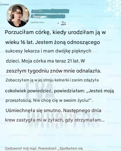 Szesnaście lat: przerażona, zawstydzona i przekonana, że moje życie się skończyło, zanim jeszcze się zaczęło. Moi rodzice załatwiali wszystko w milczeniu. Podpisywali papiery. Podejmowali decyzje. Powtarzałam sobie, że to jedyna droga naprzód. Powtarzałam sobie, że będzie miała lepsze życie bez przestraszonej nastoletniej matki, która nie jest w stanie jej niczego dać.