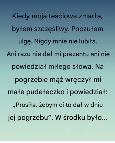 Kiedy odeszła moja teściowa, poczułam coś, czego się nie spodziewałam: ulgę. Nigdy mnie nie lubiła. Ani razu nie powiedziała mi ani jednego miłego słowa ani nie wykonała żadnego gestu. Na jej pogrzebie mąż wręczył mi małe pudełeczko i powiedział: „Prosiła, żebym ci to dzisiaj dał”.