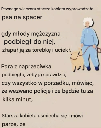Był spokojny wieczór, a starsza kobieta rozkoszowała się leniwym spacerem ze swoim małym, puszystym pieskiem. Powietrze było rześkie, a delikatny wietrzyk szeleścił w liściach drzew. Nagle ta spokojna sceneria prysła. Młody mężczyzna, poruszający się z zaskakującą szybkością, przebiegł obok niej. W mgnieniu oka złapał trzymaną przez nią torebkę i zniknął za rogiem.